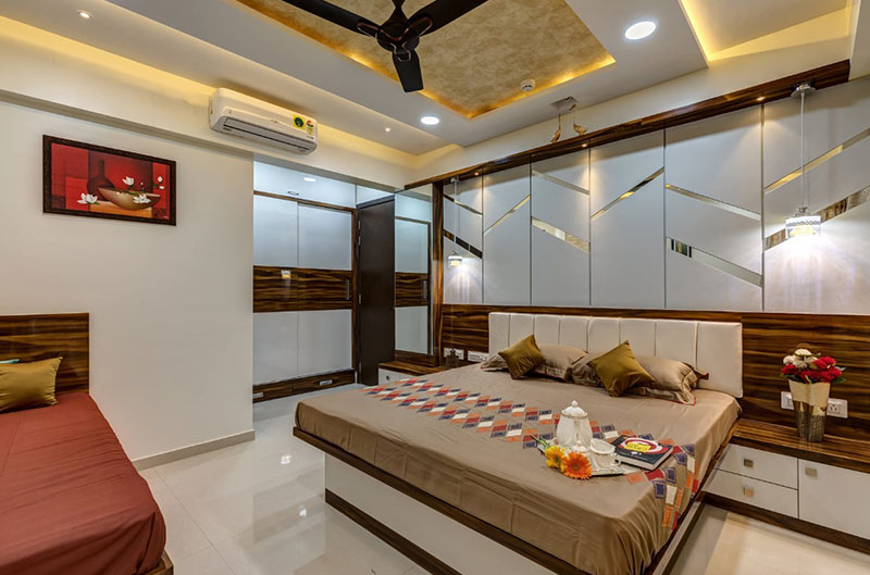 The large cupboard with running lines on two edges, the ample French window dominating the wall, the substantial mirror doubling the ambience, all contribute to further amplification of the already spacious bedroom.