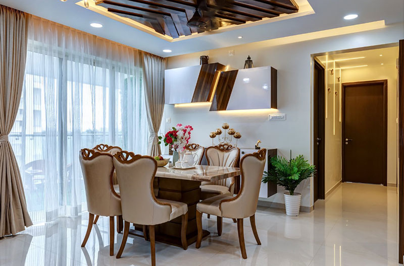 The false ceiling pattern with colorful background lighting contribute to the exotic look of the room A colorful wall hanging completes the ambience of the Dining Room – for the Connoisseur.
